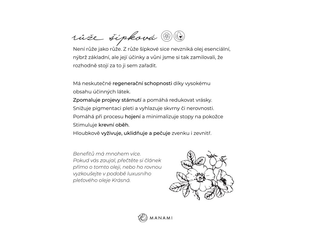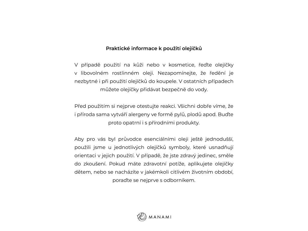 Brožurka nese popisky celkem 41 éterických esencí a olejů, které najdete v MANAMI portfoliu. U každého olejíčku nesmí chybět popis účinků a tipy na jeho použití doprovázené krásnými ručními ilustracemi Lucky Sommerové, která dala vzniknout vizuální podobě MANAMI.